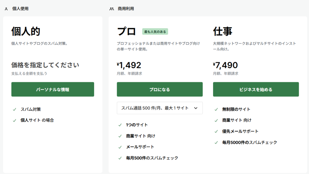 Akismetプランの選択」をクリックしてアカウントを作成していきます。