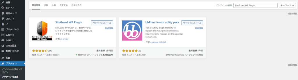 ③右上にある「プラグインの検索」で「SiteGuard WP Plugin」と入力し検索。