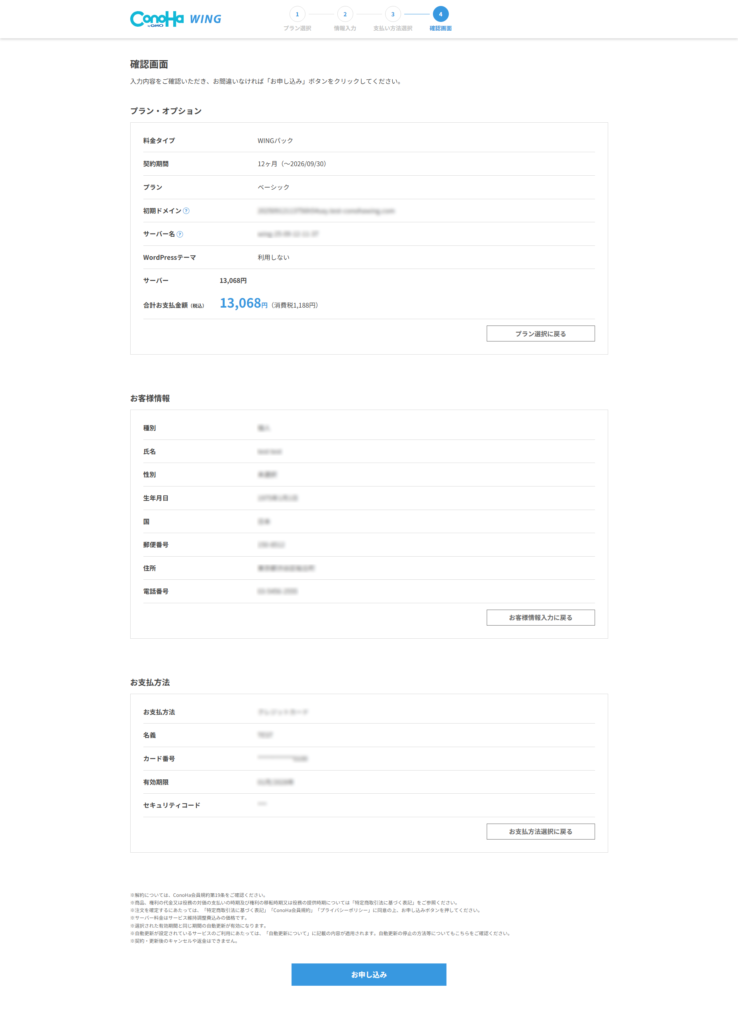 入力内容に問題がなければ、「お申し込み」をクリックで完了です!