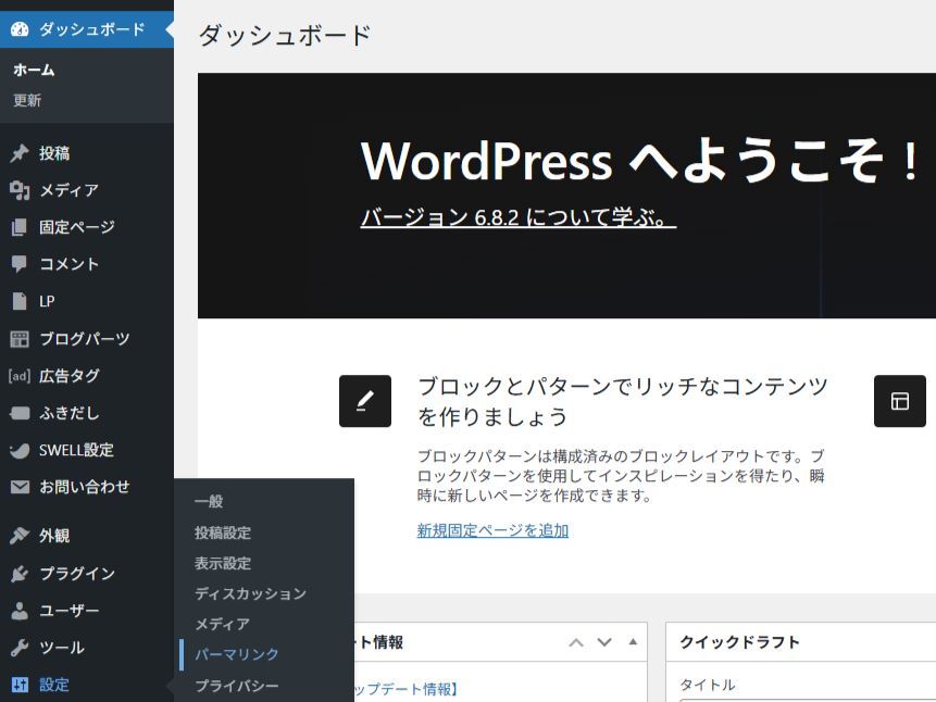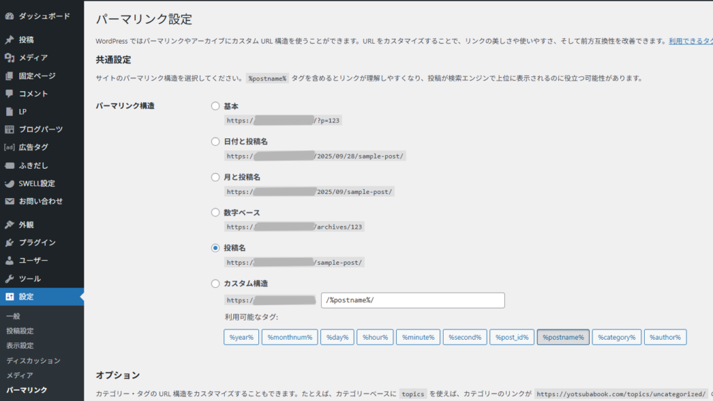 初期状態のままだと「?p=123」といった数字の羅列になるため、SEO的にも読みにくさ的にも不利なので、変更しておきます。