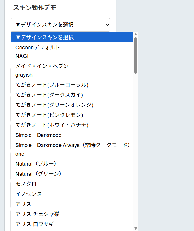 サイトの右側にある「スキン動作デモ」のタブから気になるスキンを選択し、実際どのような外観になるのか確認してみてください。